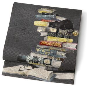 京袋帯 召しませ花 正絹 お昼寝ネコ チャコール グレー 黒猫 本 洋書 眼鏡 お太鼓 一重太鼓