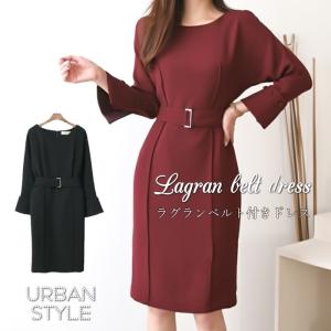 ワンピース レディース 上品 ラグラン スリット ベルトセット 長袖 膝丈 無地 30代 40代 ファッション セクシー 高級感 春秋物 新作 黒 赤