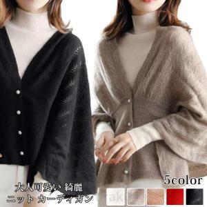 ニット カーディガン レディース ポンチョ トップス 長袖 ストール 透かし編み Vネック エレガント 体型カバー