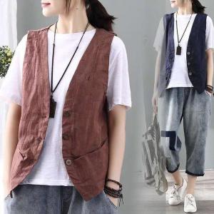 レディース綿麻ベスト夏物 可愛い 前開きノースリーブ 着痩せシンプル韓国風トップス チョッキ袖なしベスト通勤 夏物薄ベストレディース 夏おしゃれ