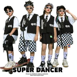 ヒップホップ 衣装 K-POP 韓国 黒 白黒 子供ダンス服 ダンスウェア キッズダンス衣装 セットアップ 派手 フラッグチェック