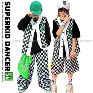 ヒップホップ 衣装 キッズ ダンス衣装 セットアップ 派手 K-POP 韓国 白 黒 フラッグチェック ベスト パンツ