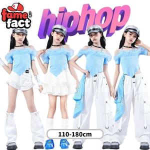 女の子用 水色トップス K-POP風 Y2K 舞台衣装 子供用パフォーマンスウェア オフショルディングデザイン 白スカート ショートパンツ カーゴパンツ 可愛らしいス
