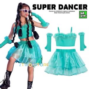 ダンス衣装 ガールズ K-POP 韓国 セットアップ へそ出しトップス チュールスカート 子供ダンス服 ダンスウェア キッズダンス衣装 派手 グリーン