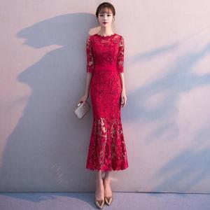赤 レース パーティードレス マーメイドドレス タイトドレス ロングドレス お洒落 成人式 二次会 演奏会 お呼ばれ 20代 30代 40代 5分袖