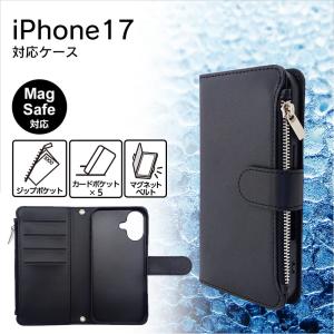 iphone17 ケース ブラック Magsafe対応 ウォレット 手帳型 カード収納 サイドポケット ストラップホール ファスナーポケット