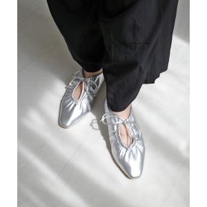 パンプス スリムスクエアトゥギャザーリボンパンプス