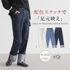 デニム レディース ボトムス ジーパン ストレートデニム ロールアップデニム 配色 ステッチ 伸縮性 「メール便不可」「20」