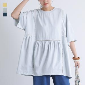 カットソー レディース トップス 半袖 クルーネック プルオーバー はしごレース 配色 ギャザー 春 夏 オシャレウォーカー「メール便可」「10」