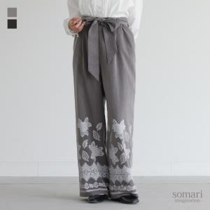 パンツ レディース ボトムス ロング丈 ストレート ワイドパンツ ウエストリボン レース柄 プリント柄 ウエストゴム 返品交換不可 「メール便不可」「30」