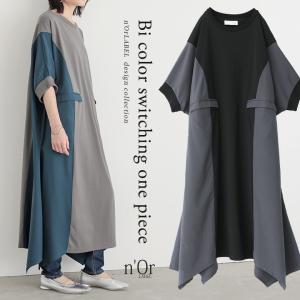 ワンピース ロング レディース 半袖 切替 異素材 カットソー シャツ生地 レイヤード 重ね着 フレア 春 夏 秋 「メール便不可」「30」