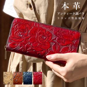 財布 長財布 レディース 本革 アンティークバラ ラウンドファスナー サイフ ウォレット 革 牛革 レザー カード収納 革財布 長サイフ 本革長財布