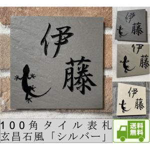 招福デザイン表札 招福動物 フクロウ ヤモリ シーサー 雀と竹 ツバメ 戸建て 石感のあるおしゃれ表札 100角玄昌石風「シルバー」 小さい 追加マグネット可