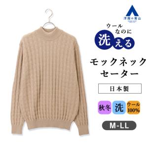 【洋服の青山】洗えるウール ウール100% モックネックセーター 長袖 メンズ 秋冬 ベージュ 編地 無地 リンクス格子柄 上質 軽量 軽い 洗える 暖かい 保温