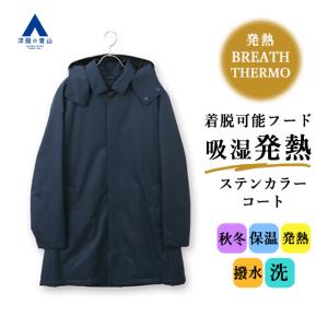 【洋服の青山】吸湿 発熱 ステンカラーコート メンズ スリム 秋冬 ネイビー 紺 無地 大きいサイズ 暖かい 保温 軽い 撥水 耐水 軽量 防風 雨 雪 着脱可能フード