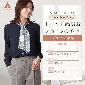 【洋服の青山】スカーフタイ付き ブラウス 長袖 長袖 春夏 秋冬 ネイビー 紺無地 2WAY Vネック シワになりにくい 防シワ 静電気防止 オフィス ビジネス 仕事