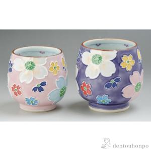 交趾花絵 組湯呑 ピンク 紫 ペア ( 名入れ有料 湯呑み 湯のみ セット 湯飲み おすすめ 清水焼 京焼 結婚 出産 内祝い 引き出物 金婚式 誕生日プレゼント )