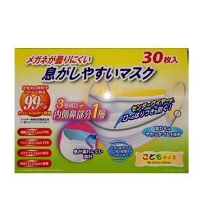 メガネが曇りにくい息がしやすいマスク子供サイズ30枚入(不織布使用)ウイルス対策!(配送区分:A2)