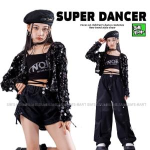 ダンス 衣装 キッズ 黒 スパンコール キラキラ衣装 セットアップ K-POP 韓国 子供ダンス服 ダンスウェア ガールズ へそ出しトップス ショートパンツ