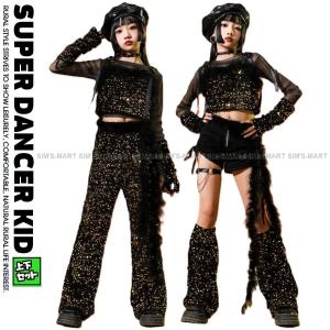 ダンス衣装 ガールズ 衣装 派手 K-POP 韓国 ジャズ セットアップ スパンコール キラキラ衣装 へそ出し ファー 子供ダンス服 ダンスウェア ゴールド 黒