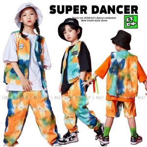 キッズダンス衣装 セットアップ ヒップホップ ファッション ダンス衣装 ベスト パンツ タイダイ柄 派手 K-POP 韓国 オレンジ