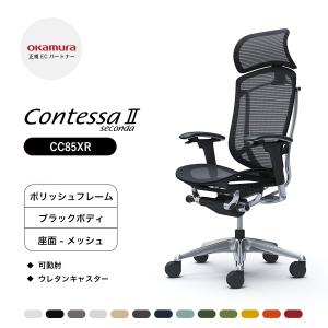 オカムラ コンテッサ セコンダ 大型固定ヘッドレスト CC85XR 可動肘 ポリッシュフレーム ブラックボディ 座:メッシュ ウレタンキャスター オフィスチェア
