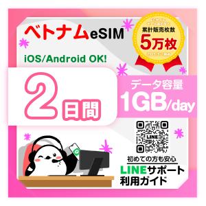 ベトナムeSIM:使用日数:2日間/データ容量:1GB(day)/簡単設定/有効期限90日/最短即日発行/パスポート番号不要/データ通信専用