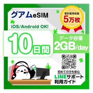 グアムeSIM:使用日数:10日間/データ容量:2GB(day)/簡単設定/有効期限90日/最短即日発行/パスポート番号不要/データ通信専用