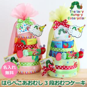 おむつケーキ はらぺこあおむし 出産祝い 名入れ 男の子 女の子 3段 タオル おもちゃ にぎにぎラトル ソフトブックミニ フラップ ベビー 新生児 ギフト 双子