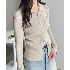 ニット セーター ゴールドボタンポロ襟リブニットトップス レディース