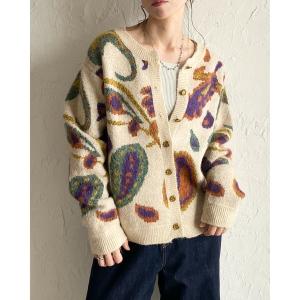 カーディガン ゴールドボタン配色ジャガードカラーニットカーディガン レディース