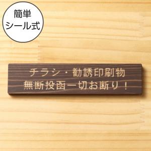 チラシ 勧誘印刷物 無断投函一切お断り サインプレート 木製 ダークブラウン 迷惑投函 広告 禁止 国産ヒノキ 多少の水濡れOK シール式 メール便送料無料