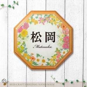 表札 おしゃれな木製表札 風水表札 フラワーリング R 八角形 黄色 戸建 マンション 二世帯 連名 サロン データ入稿可 雨ざらし不可 取り付け簡単 吊り下げにも