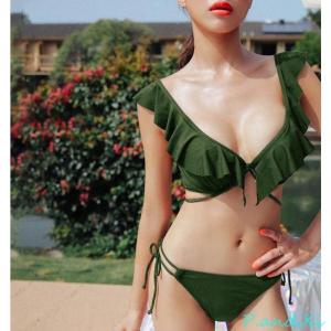 水着 バンドゥビキニ レディース ワイヤー入り 小胸 バスト盛れる 三角ビキニ 水着 バンドt付 シンプル フリル 大人可愛い