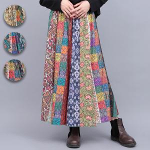 ファブリックプリントジャージースカート / ロングスカート Mサイズ Lサイズ 2サイズ 秋 冬 春 夏 フレア ウエストゴム 総柄 花柄 パッチワーク カラフル
