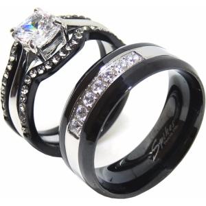 【並行輸入品】彼の彼女のカップルリングセットレディースブラックステンレススチールプロミスリングメンズ7 CZウェディングバンド