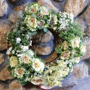 【当店オリジナル】 ブーケハボタンのホワイトカラーリース寄せ植え Lサイズ 【現品66】