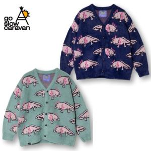 送料無料 ゴースローキャラバン ウーパールーパー ジャガード シャギー ニット カーディガン 総柄 ユニセックス メンズ レディース アクアブルー 紫 パープル