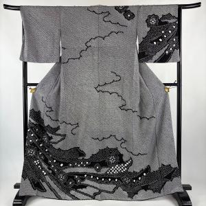 美品 訪問着 身丈166cm 裄丈67.5cm L 袷 熨斗 花 総絞り 黒 正絹 名品 中古