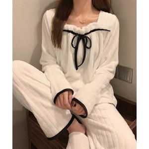 パジャマ ルームウェア リボン付き リブ フリース ルームウェア セットアップ レディース