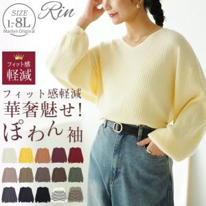 大きいサイズ レディース トップス フィットしすぎない 細魅せ叶える 華奢魅せ美人 もっちり リブ Vネック ぽわん袖 ニット セーター LL 3L 4L 5L A