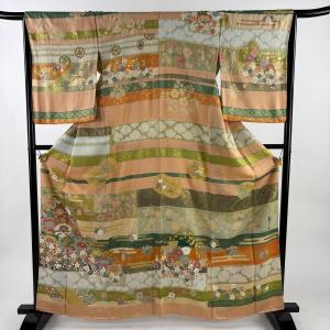 訪問着 身丈163cm 裄丈66cm M 袷 松井青々 落款あり 草花 ヱ霞 金糸 金彩 薄オレンジ 正絹 逸品 中古