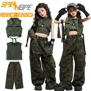 カーキグリーン 迷彩柄 キッズ ダンス衣装 セットアップ 韓国 k-pop HIPHOP jazz 女の子 ヒップホップ ダンスウェア ジャズダンス へそ出し ベスト カーゴパンツ