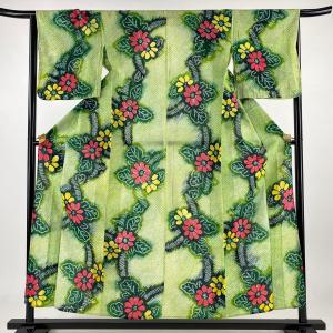 浴衣 身丈155cm 裄丈65cm M 絞り浴衣 草花 鶯色 綿 名品 中古