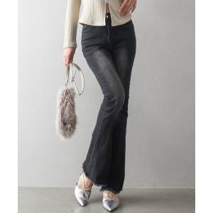 ジーンズ デニム デニムパンツ 「履き心地×脚長効果」軽やかすそフリンジストレッチデニムフレアパンツ レディース