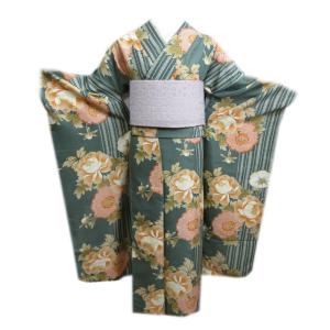 【訳有り 少難あり】 振袖 お買上 お仕立上がり 単品 渋緑色地牡丹ひったライン フリー ポリエステル 成人式 購入 リメイク 生地 古典柄 和柄