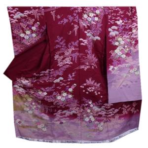 【訳有り 難あり】 振袖 正絹 お買上 未仕立て 仮絵羽 単品 濃ワイン色地ラメ入り桜古典柄 成人式 購入 リメイク 生地 和柄 和裁 練習用