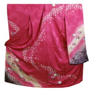 【訳有り 難あり】 振袖 正絹 お買上 未仕立て 仮絵羽 単品 濃ピンク地八重桜小さくら 成人式 購入 リメイク 生地 和柄 和裁 練習用