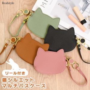 パスケース リール付き 小銭 レディース 猫 ネコ パスポーチ 定期入れ 小物入れ フェイクレザー ストラップ 通勤 通学 かわいい 薄型
