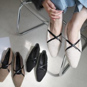 パンプス ボア フラット クロスストラップ 1センチヒール ローヒール レディース 歩きやすい ぺたんこ アミアミ